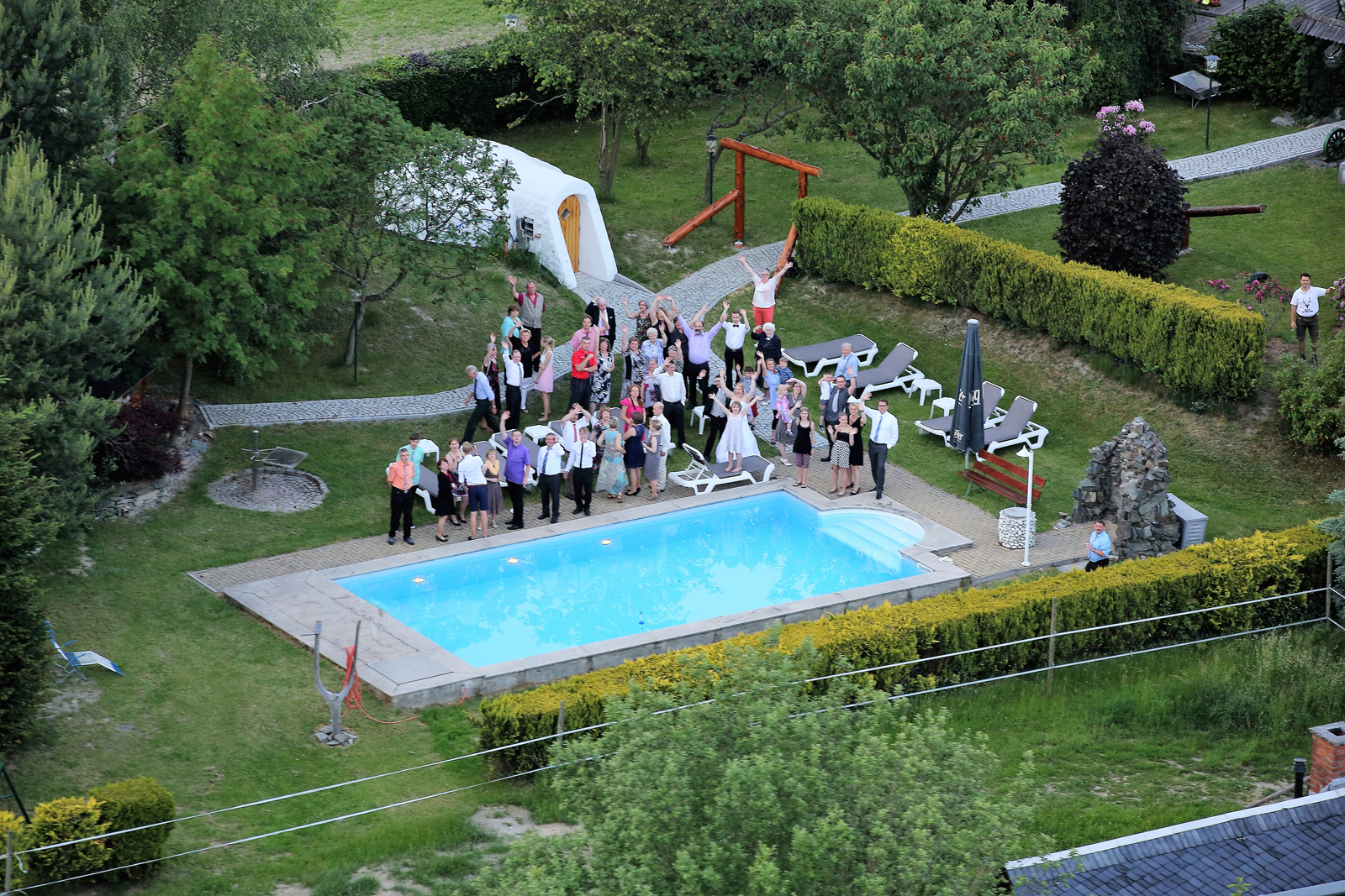 Pool und Saunalandschaft mit großem Garten